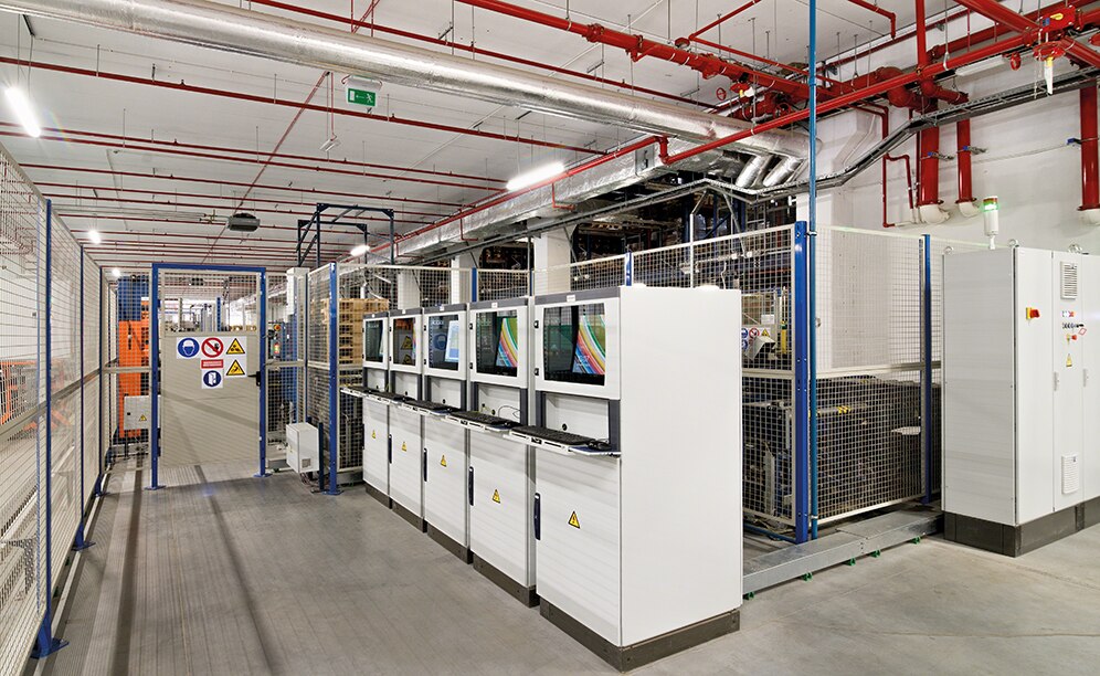 A buffer was enabled with 120 pallet positions for high-turnover pallets. These remain on-hold to avoid unnecessary movements of the stacker cranes and the constant flow of incoming and outgoing goods on this floor and are managed by two transfer cars.