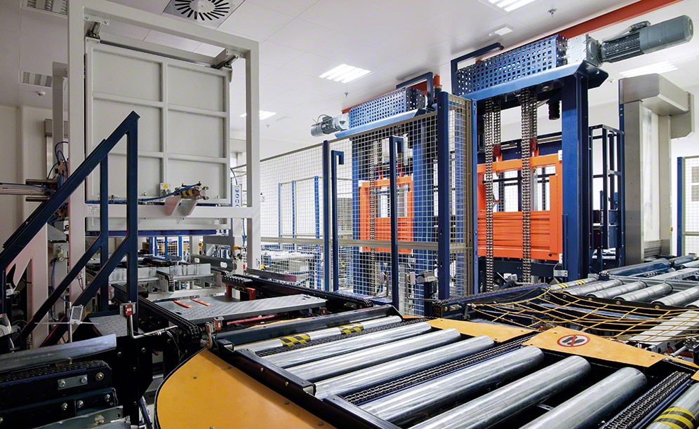 Product box packaging is done on this level. The AGVs move the goods to an automatic stretch wrapping machine that ensures the load’s stability. Onsite they also print labels and stick these on the pallets so they can be identified.