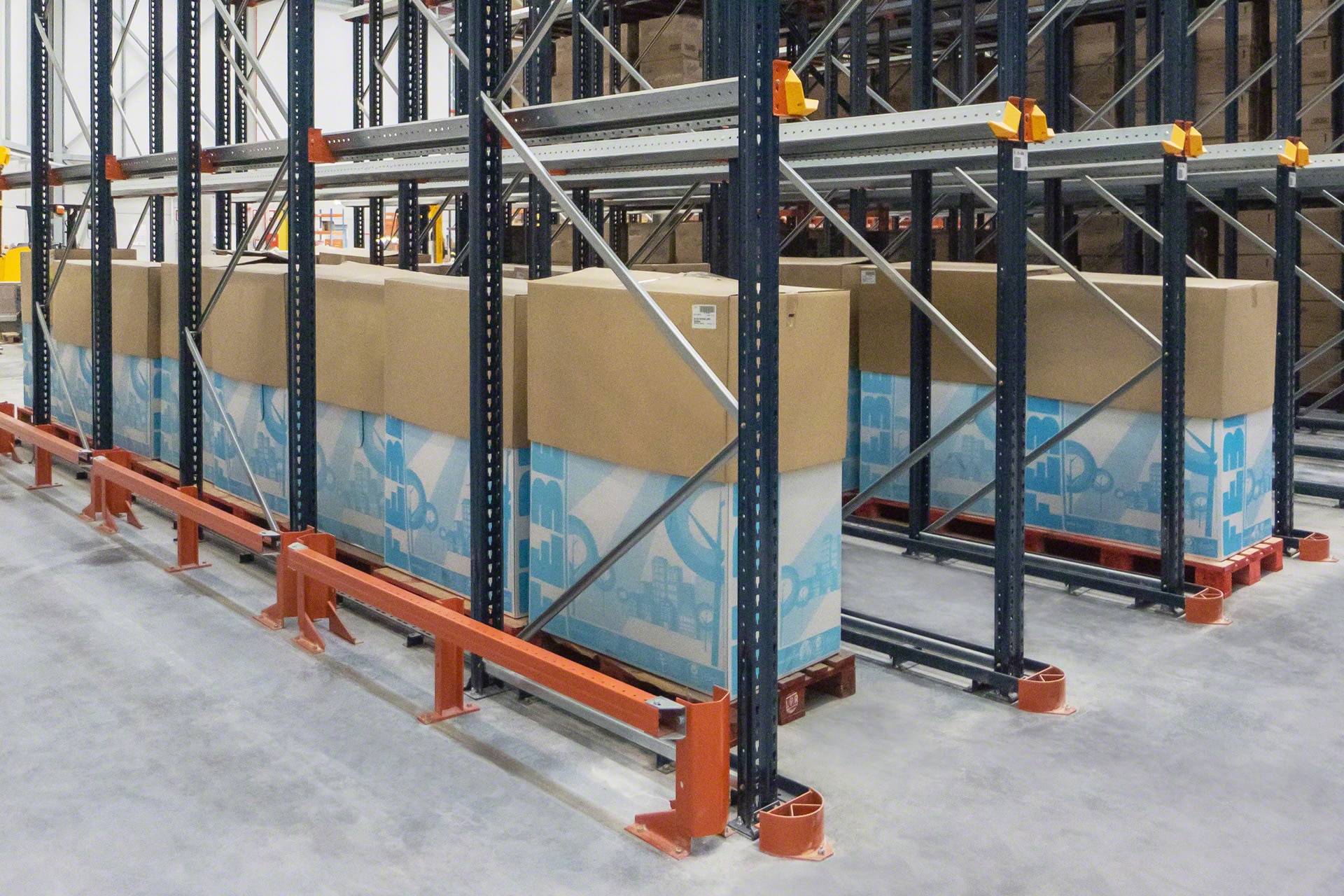 Interlake Mecalux drive-in pallet racks have a series of components — some optional — that reinforce the safety of the system and help to prevent accidents when forklifts operate inside it.