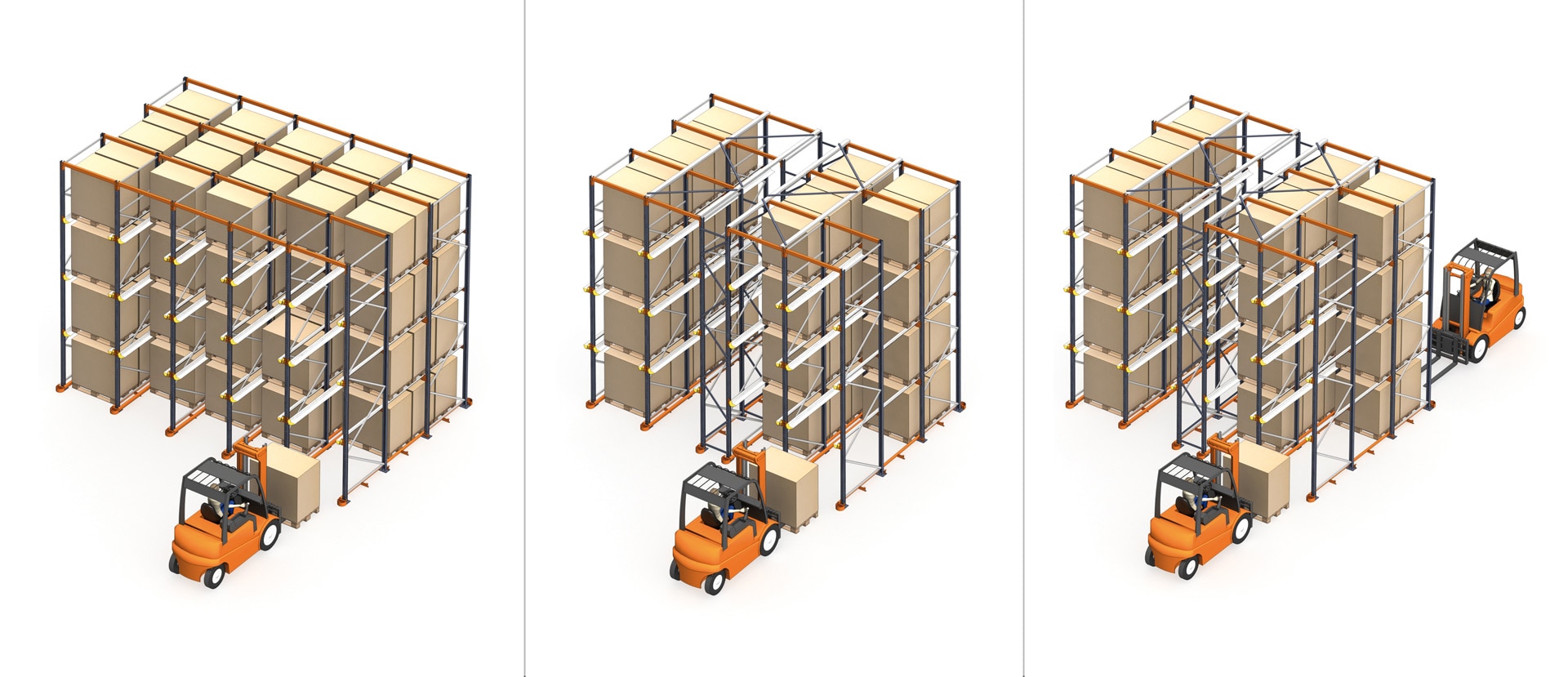 Load management depends on the configuration of the racks. With drive-in pallet racking, storage and retrieval are carried out from a single working aisle. With drive-through pallet racking, two different aisles are used.