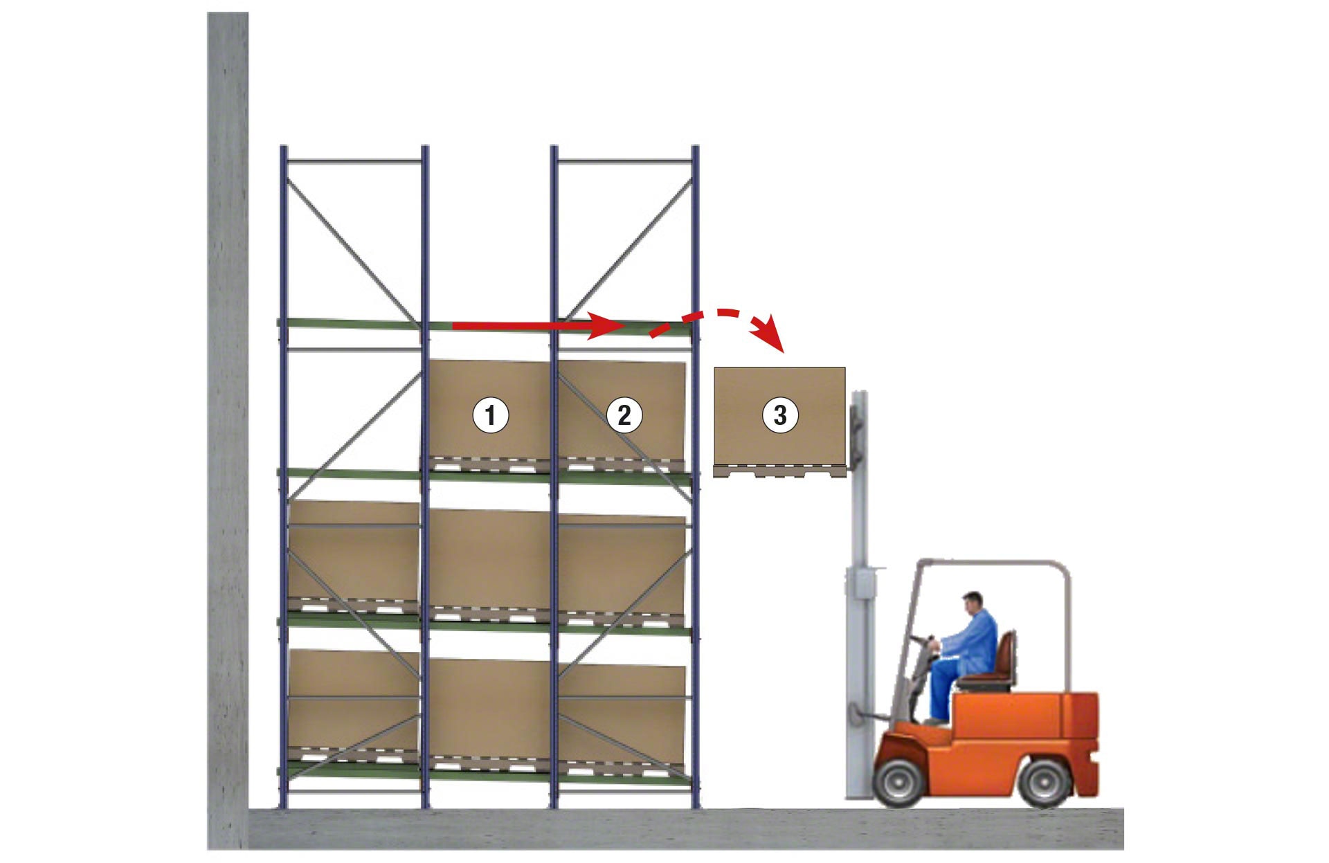 Pallets should be placed from the designated entry side, with the first pallet resting on the top cart. Subsequent pallets push the prior ones into the racking until the last pallet is positioned on the rails. For unloading, the process is reversed, allowing gravity to automatically fill the first pallet position.
