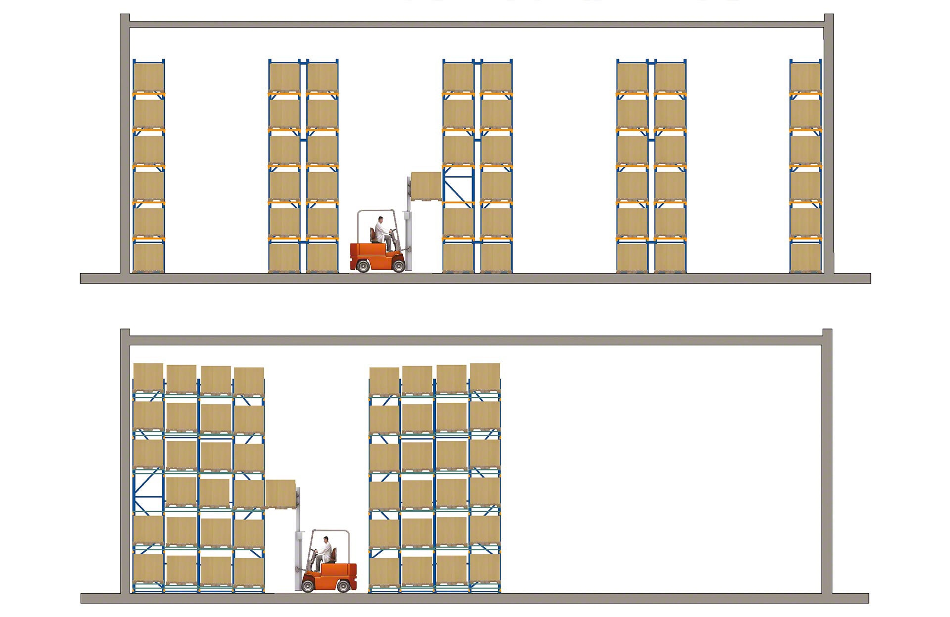 - Time efficiency: Since forklifts stay in one aisle and don’t enter the racks, loading and unloading become much faster.